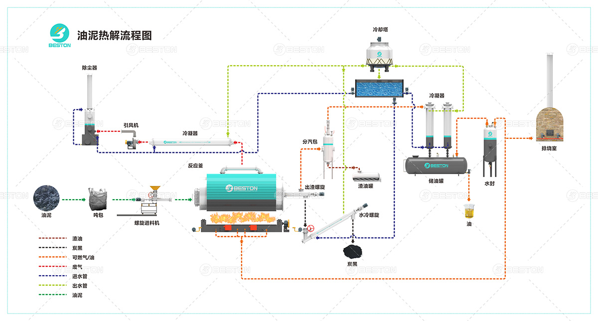 全連續(xù)油泥熱解煉油設(shè)備由反應(yīng)釜、驅(qū)動系統(tǒng)、取樣器、螺旋除渣器、汽包系統(tǒng)、靜電除塵器、水冷出渣機(jī)、油氣冷凝系統(tǒng)、水冷炭黑儲存罐、螺旋進(jìn)料機(jī)、稱重機(jī)、料倉等幾部分組成 ;間歇/半連續(xù)油泥熱解煉油設(shè)備由引風(fēng)機(jī)、煙道冷凝器、排燒室、汽包和渣油罐、三合一冷凝器、出料系統(tǒng)、驅(qū)動系統(tǒng)、裂解主爐、液壓進(jìn)料機(jī)構(gòu)、除塵塔等幾部分組成。